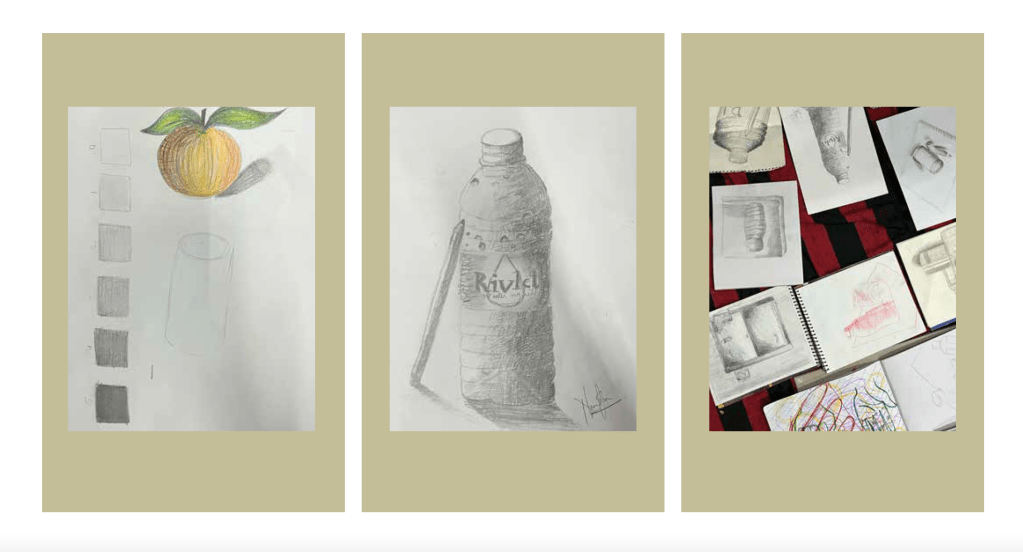 The students wanted to learn shading. In response I designed this workshop in which we explored light and shadow. We drew the value scale to understand how to differentiate between different degrees of lightness. We observed how light and shadow forms on basic objects such as cubes, spheres, and cylinders and how to represent this in two dimensions. Finally, we observed objects around us and learnt to differentiate the multiple ways in which light and shadow forms patterns creates a 3 dimensional form.
