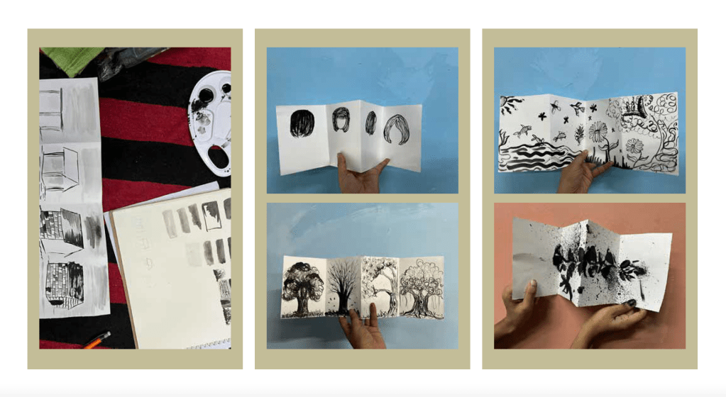 We learnt how to use black india ink by exploring different brush techniques, and also, diluting the ink to different values of black – something that was in continuity with the exploration in our light and shadow class. Following this, we planned a 4-frame mini book in which each page of the book had to be linked to the other pages under a unifying concept.