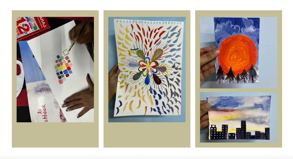 We used just the three primary colors along with black and white, and mixed these colors freely in various proportions to form a range of tints and shades which we expressed in our color libraries. The aim of the workshop was to restrain ourselves to just the three main hues and understand how how those led to a range of muted colors – without depending on the formality of the newtonian color wheel. After this activity we made small postcard size paintings in which we used some of the new colors we had created.