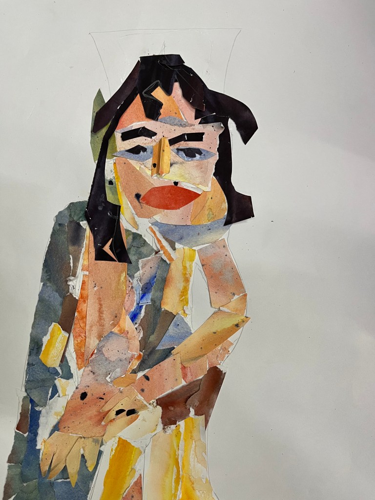 We used freestyle water color wash techniques to create a range of colored papers. And then, using the concept of paradoilia as a starting point we created specific forms which we filled in with our communal collection of colored paper. I asked the students to use strange shapes such as wet patches on ceilings and cloud shapes to see if they suggested a familiar form. And then, to use that form as the basis for our paintings.