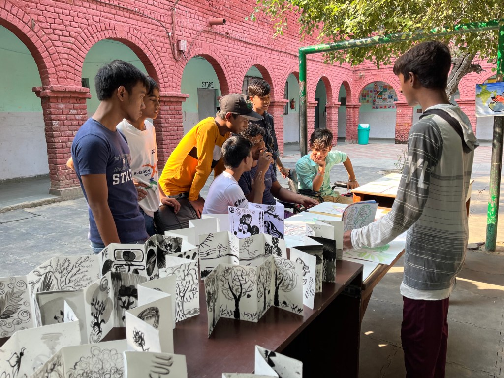 In the seventh workshop we set out to draw from observations the scenes around us. I introduced them to the idea of framing by sharing the works of many artists and how they had framed nature. I also taught them to make the square frame to constrain what we are seeing and only draw what was visible within the frame. They really enjoyed using this device.