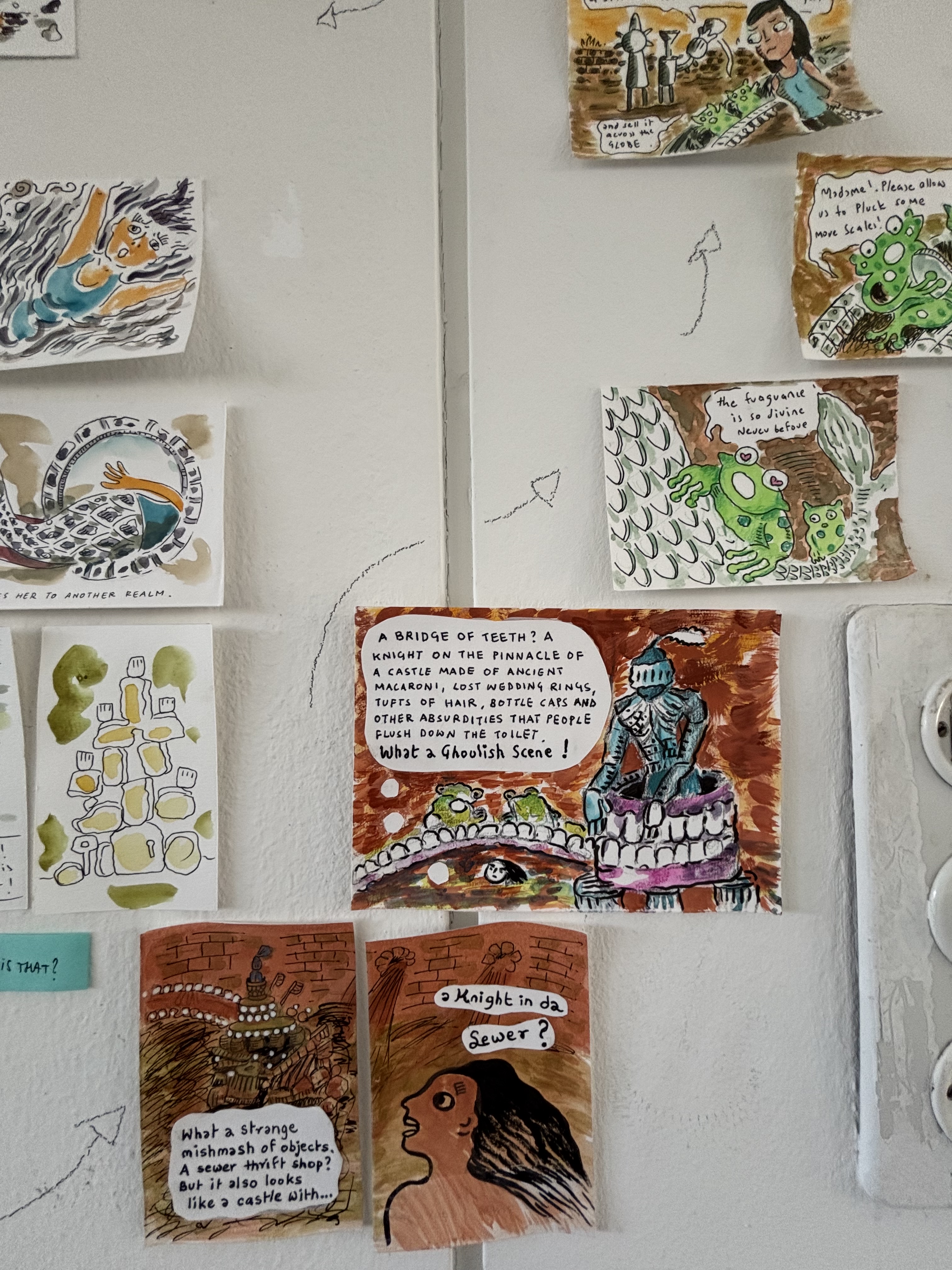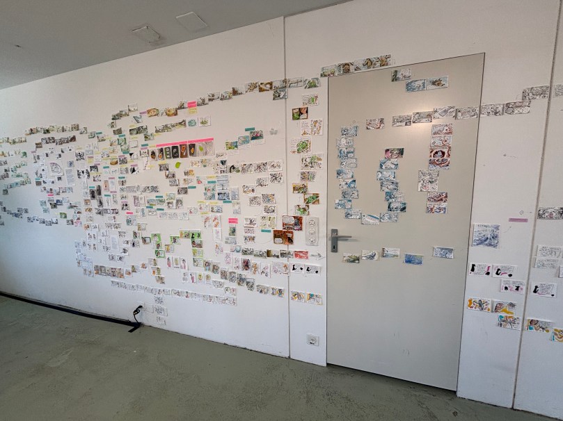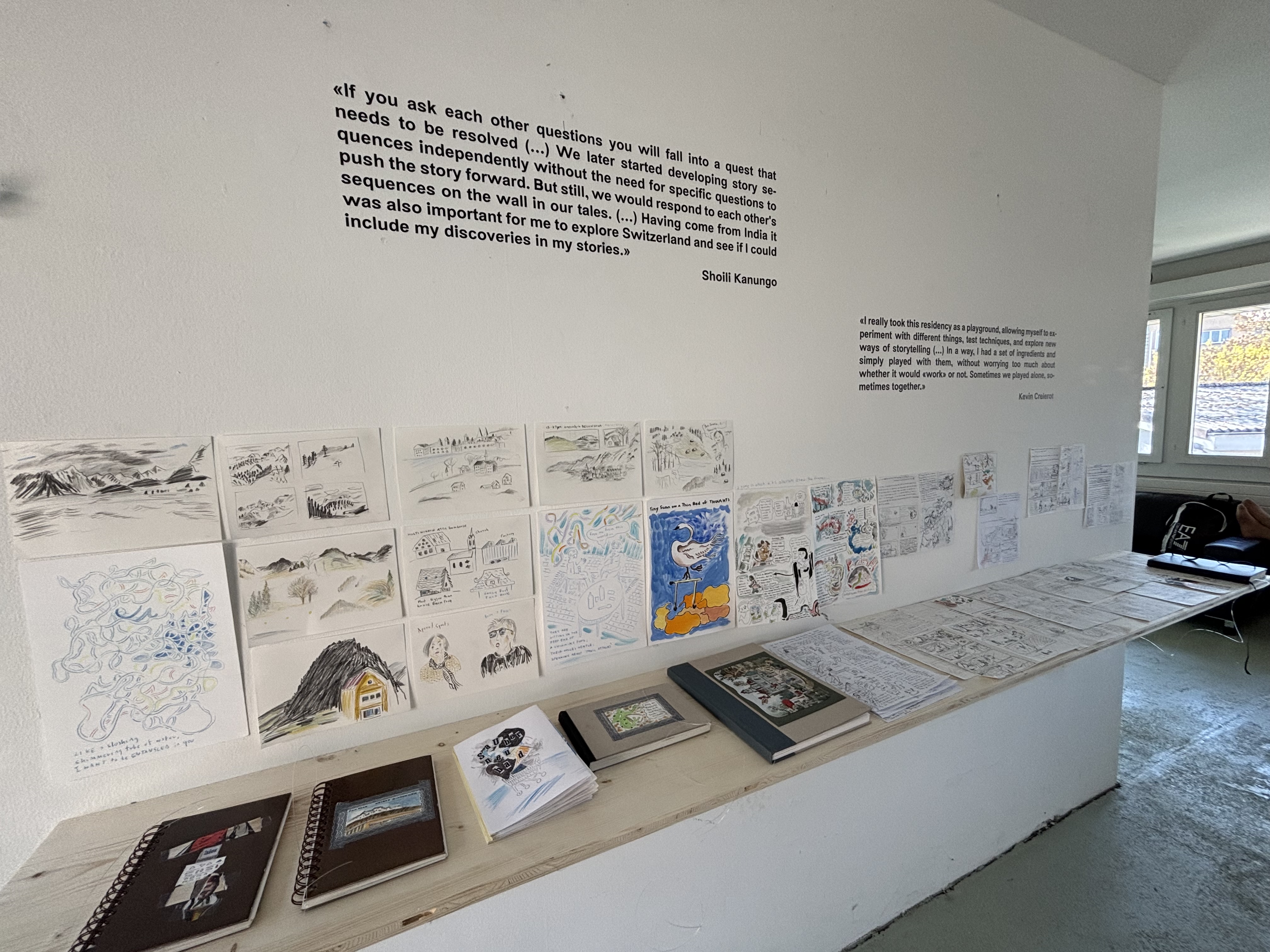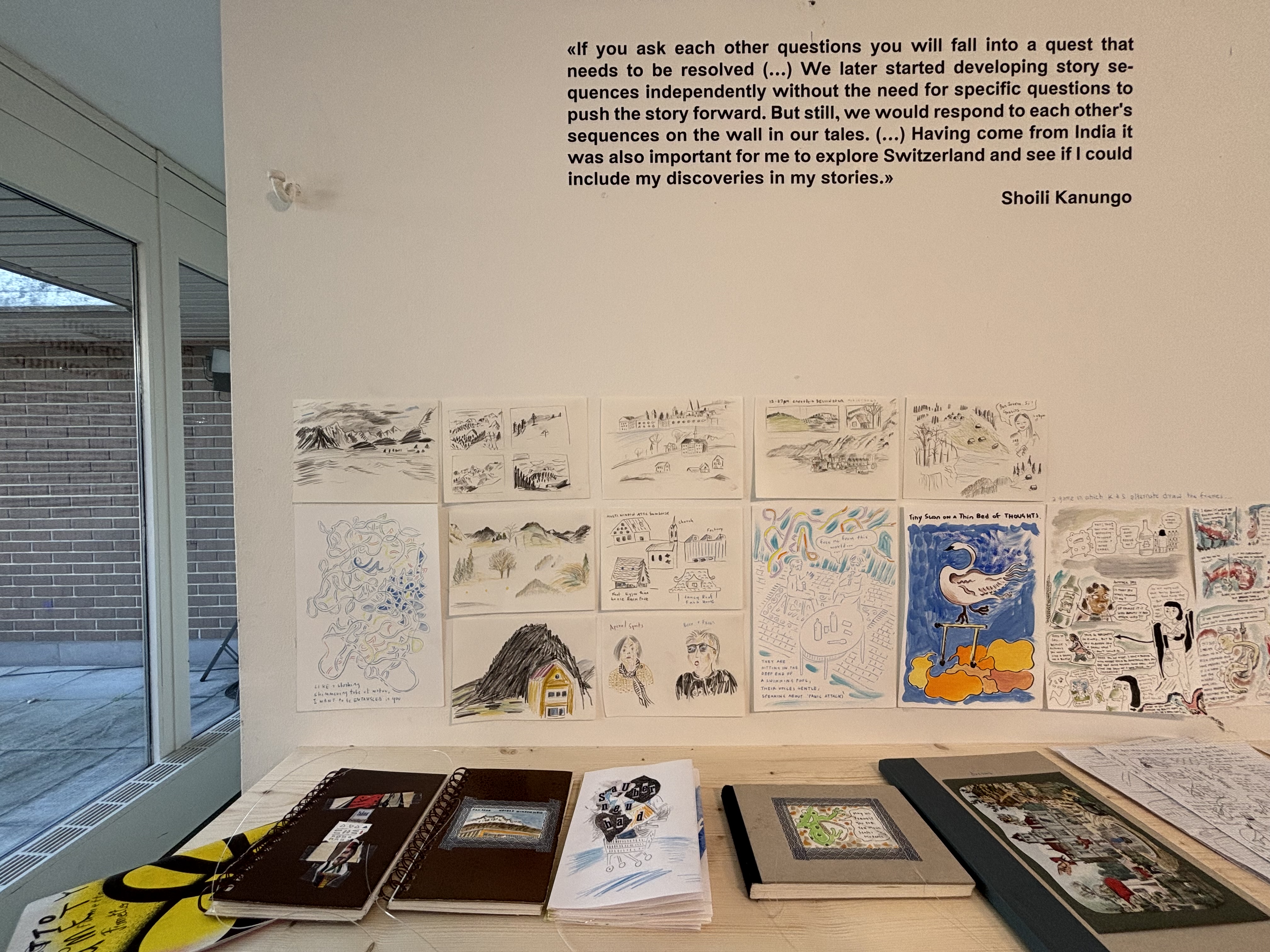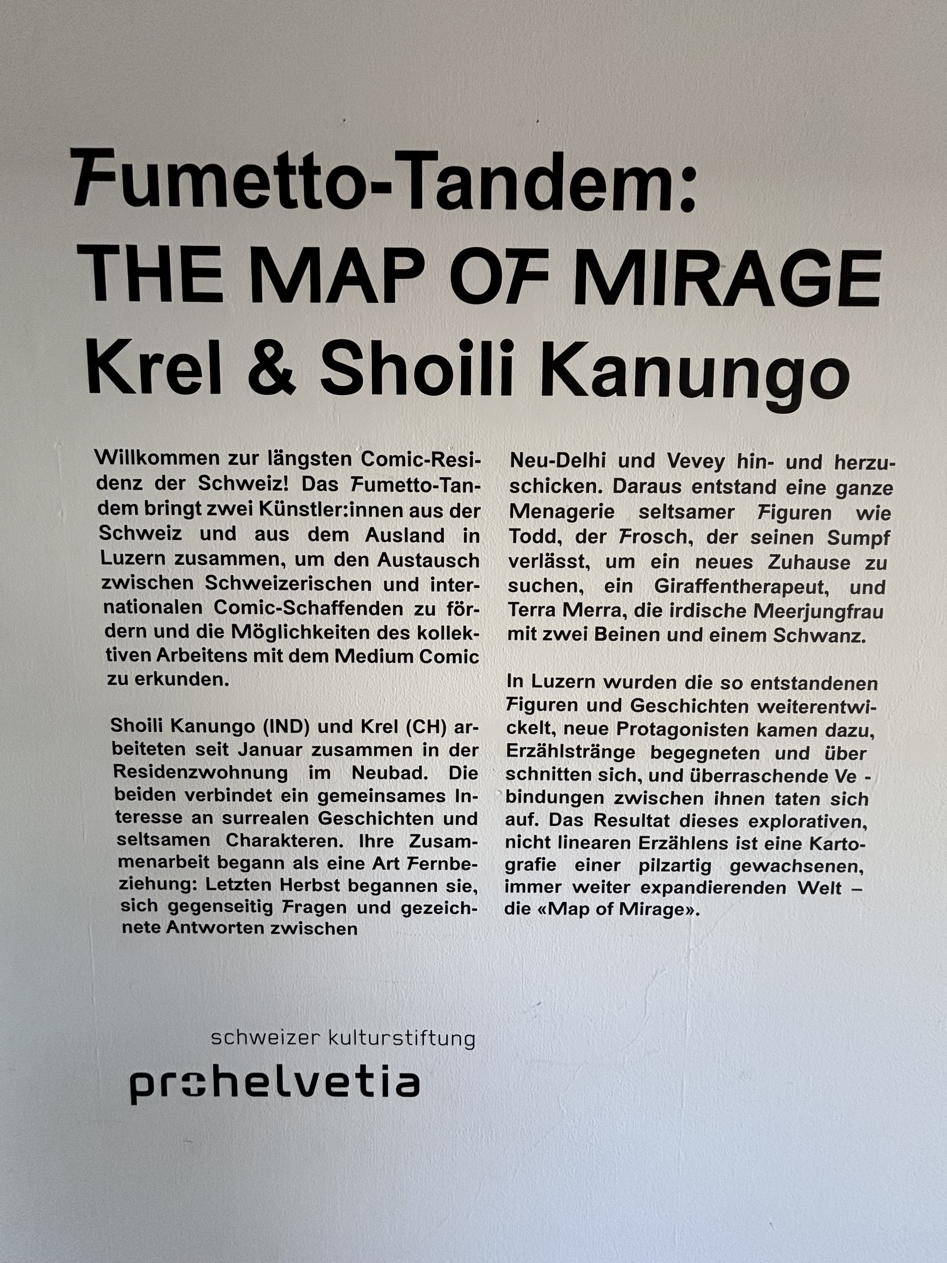 Shoili Kanungo and Kevin Crelerot, artists in resident at the Pro Helvetia – Fumetto Tandem Comic Art Residency 2025, created The Map of Mirage, a sprawling wall comic of more than 500 images that weave and intersect in surprising ways to create an endless story composed of both disparate and interconnected scenes.