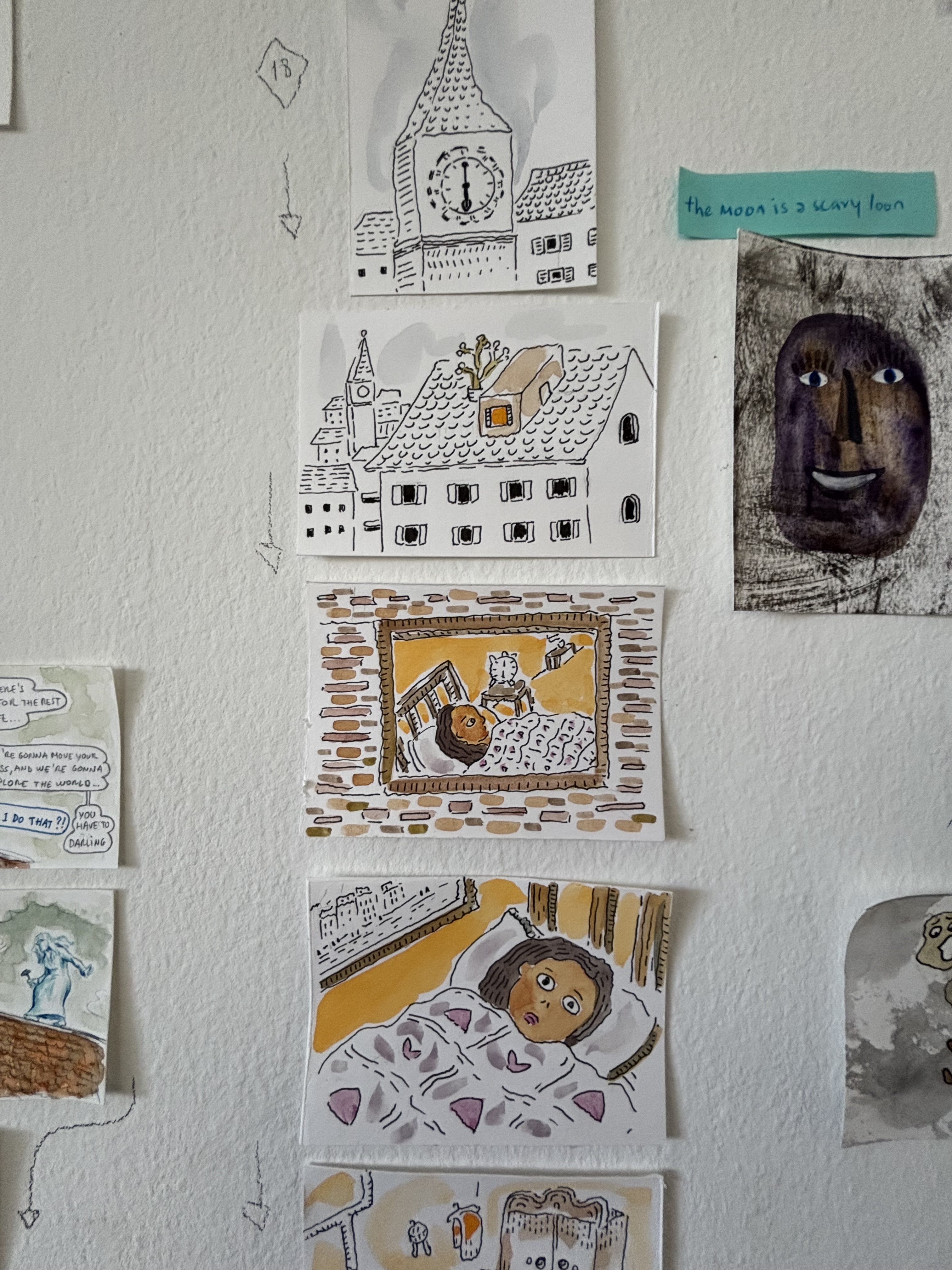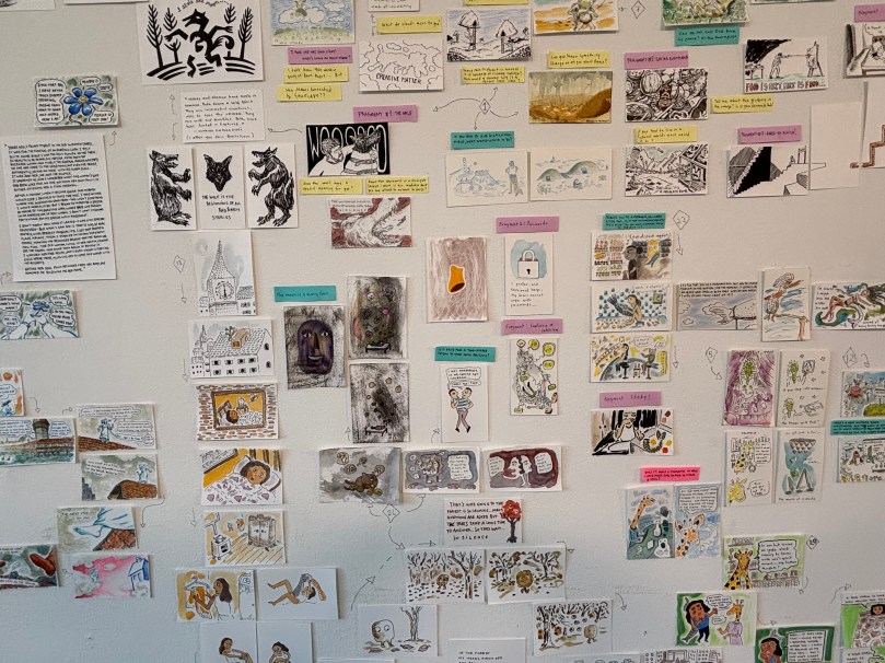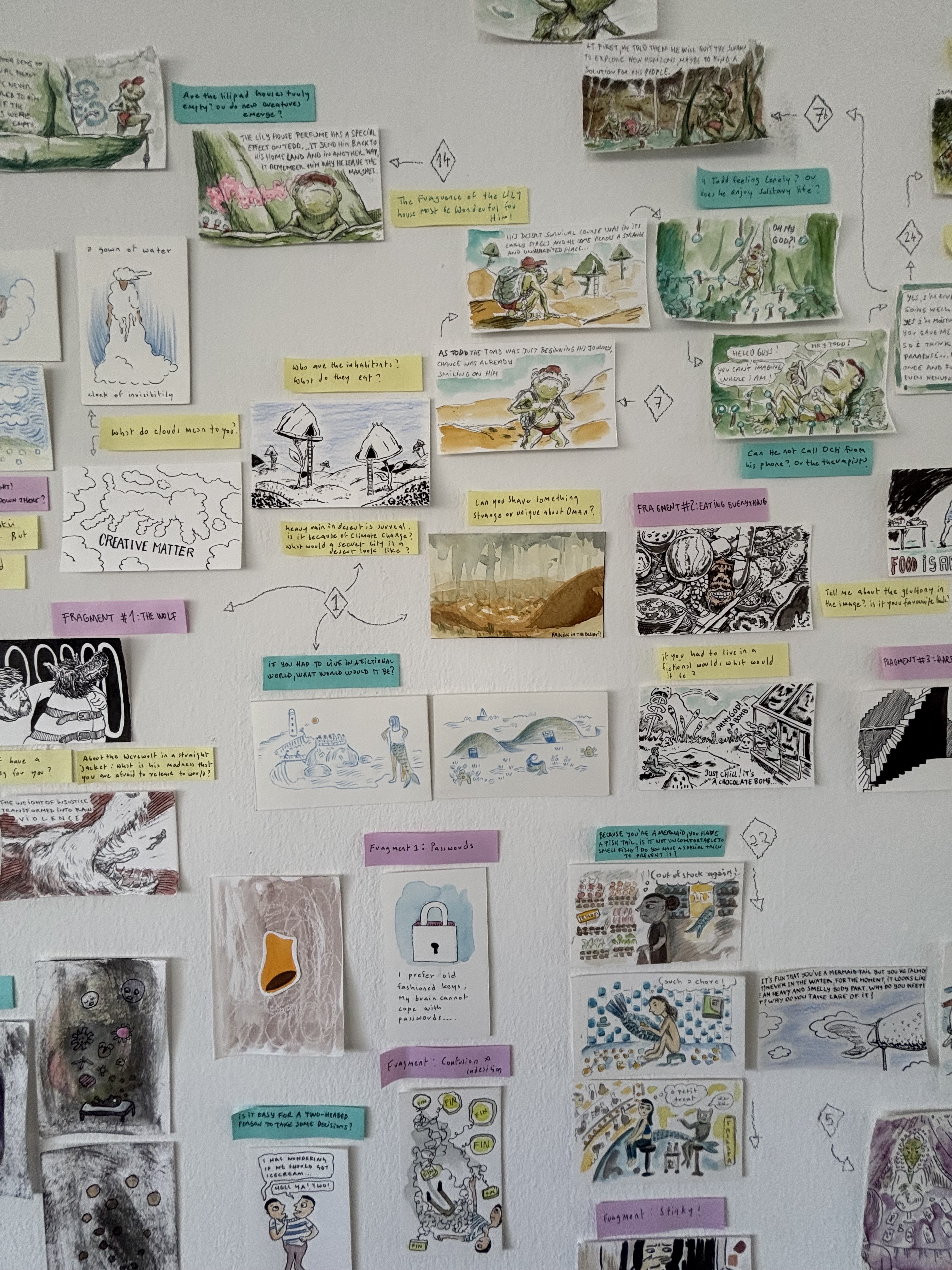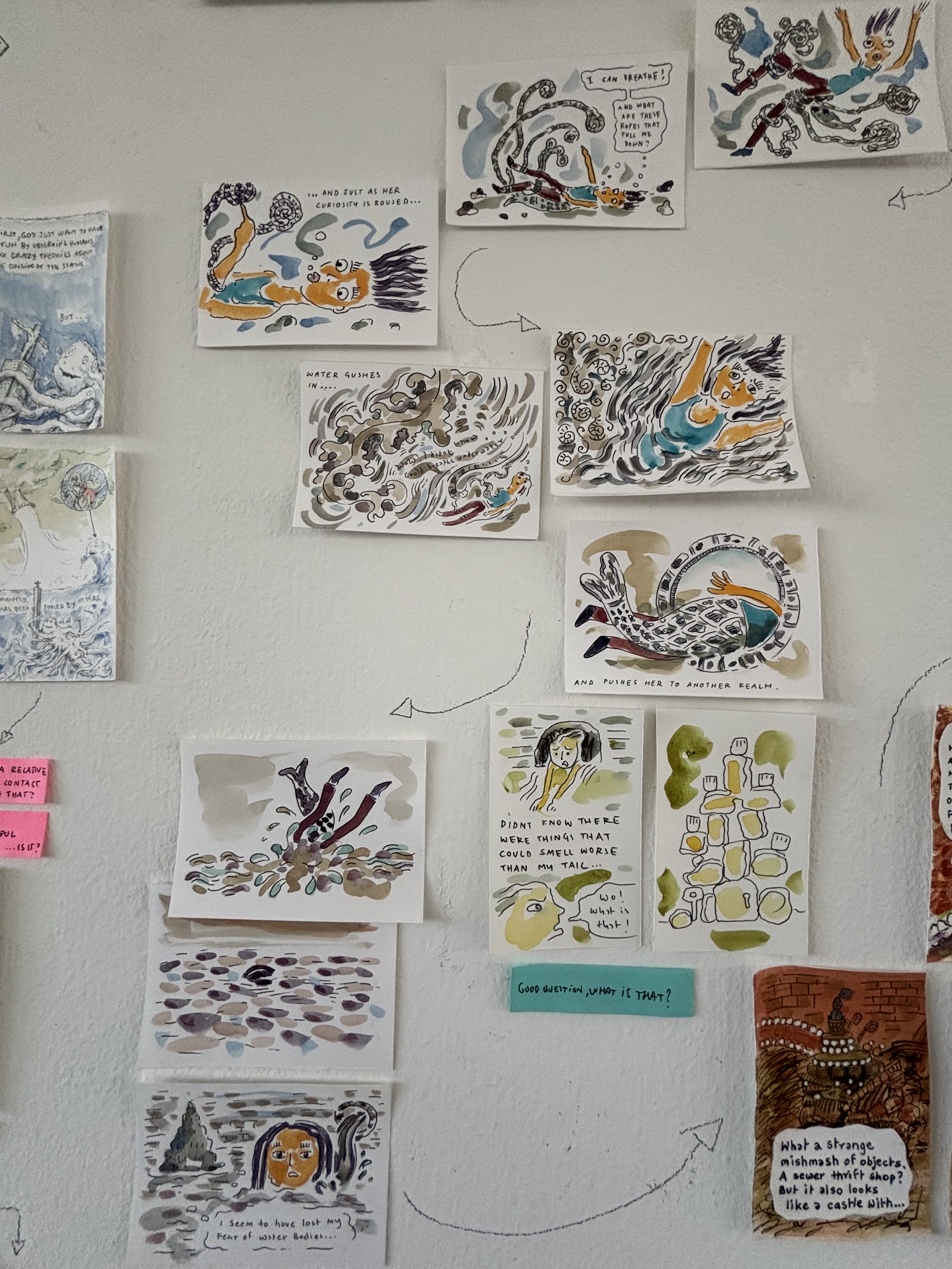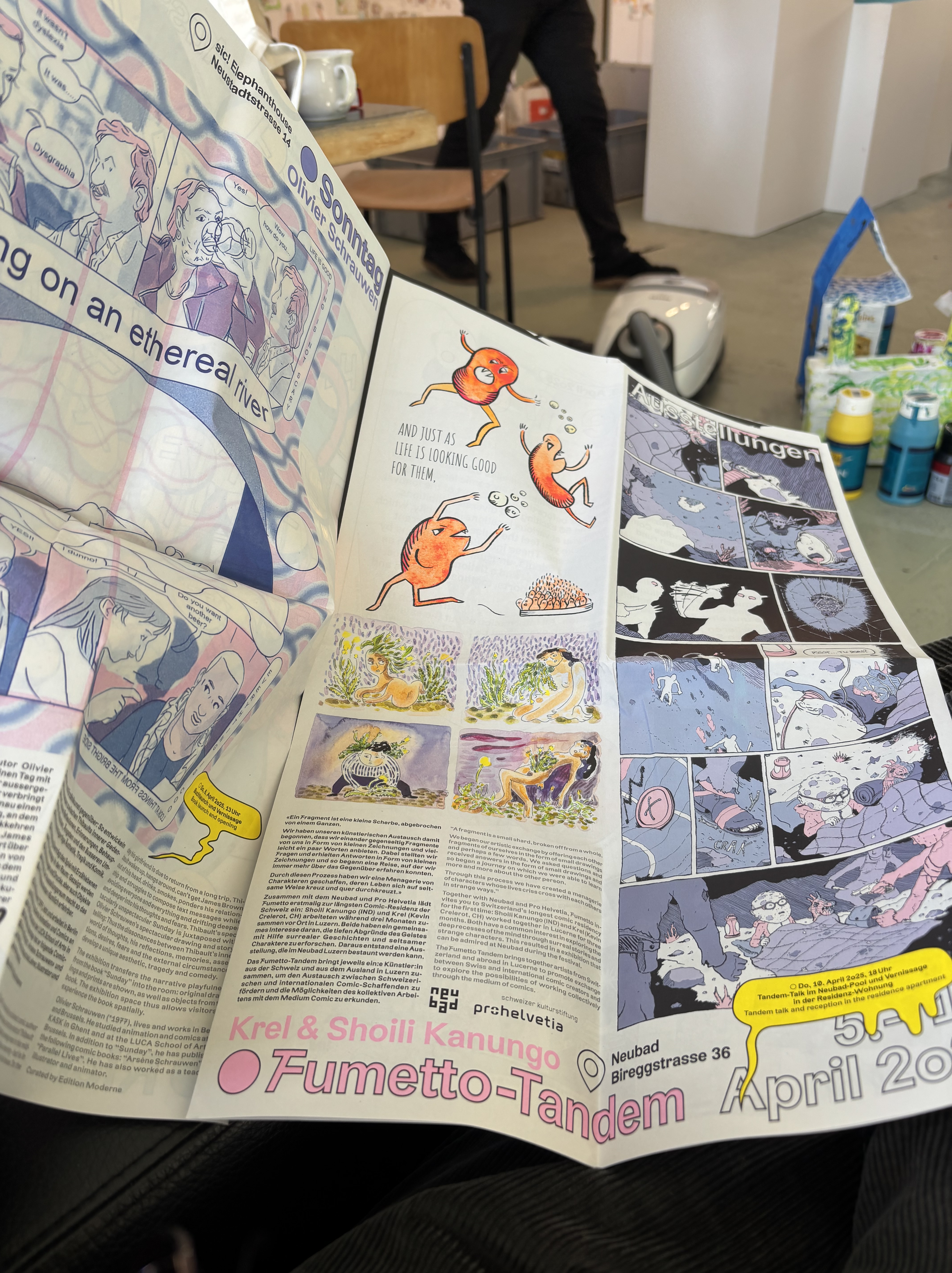Shoili Kanungo and Kevin Crelerot, artists in resident at the Pro Helvetia – Fumetto Tandem Comic Art Residency 2025, created The Map of Mirage, a sprawling wall comic of more than 500 images that weave and intersect in surprising ways to create an endless story composed of both disparate and interconnected scenes.