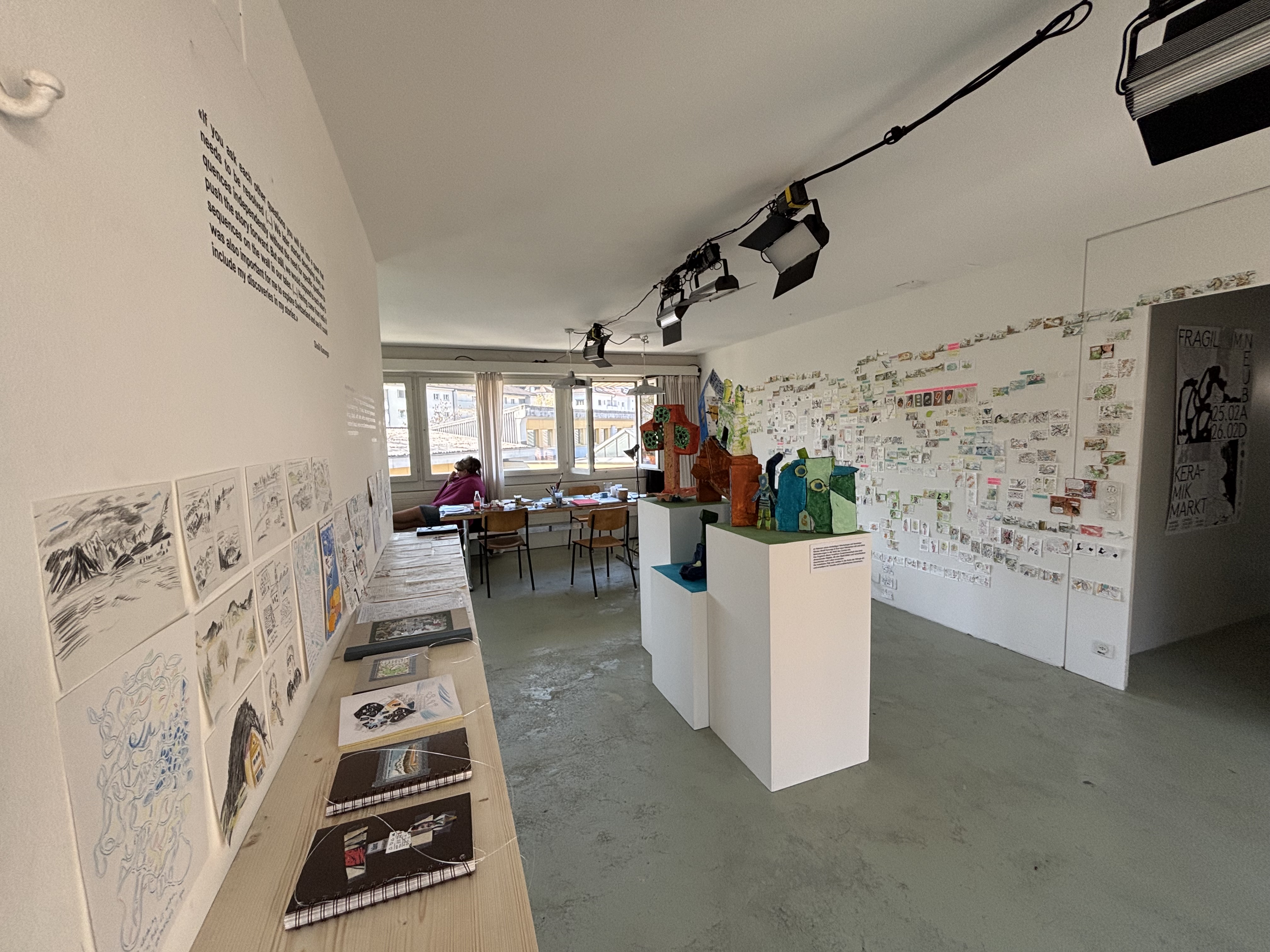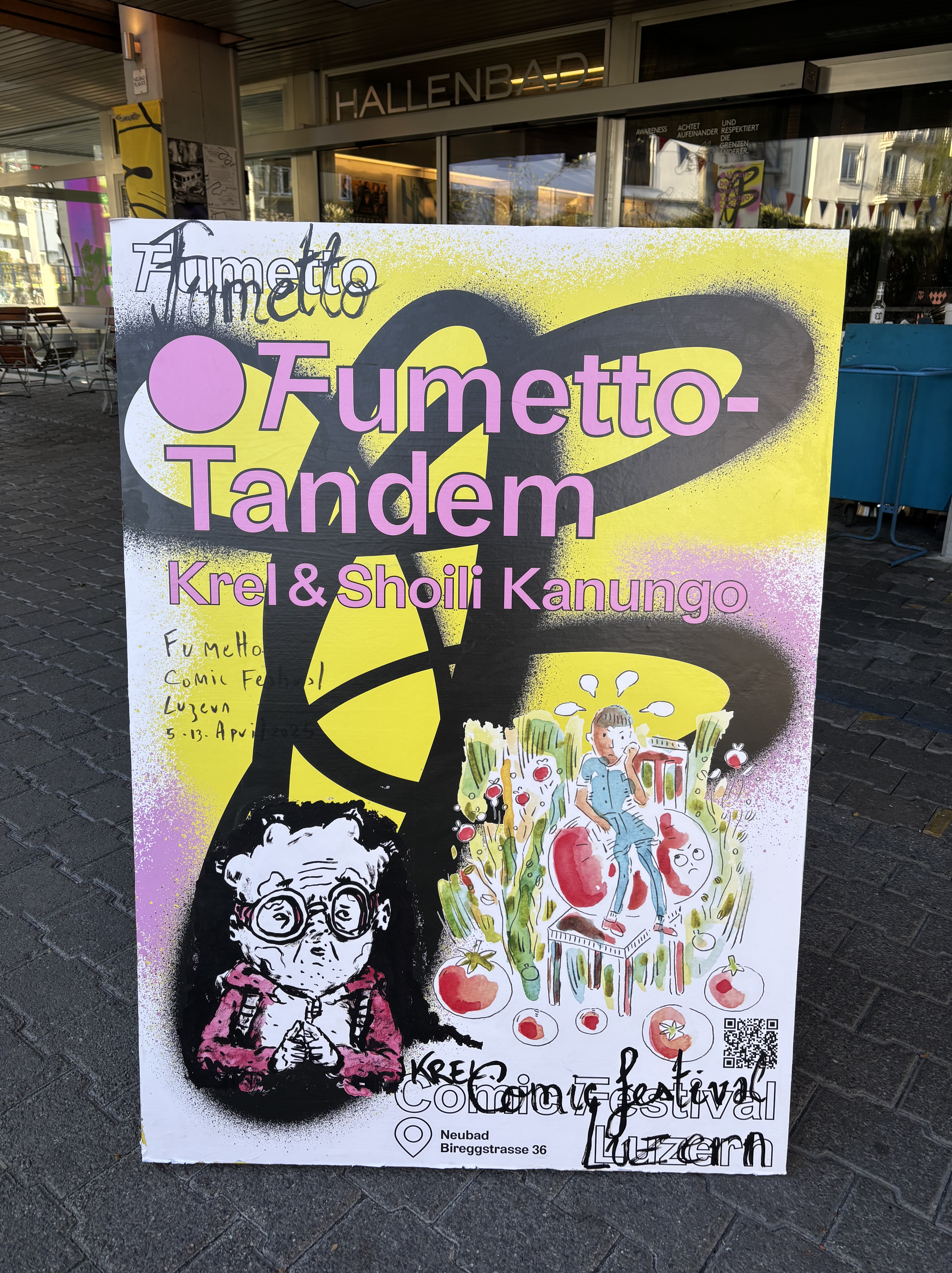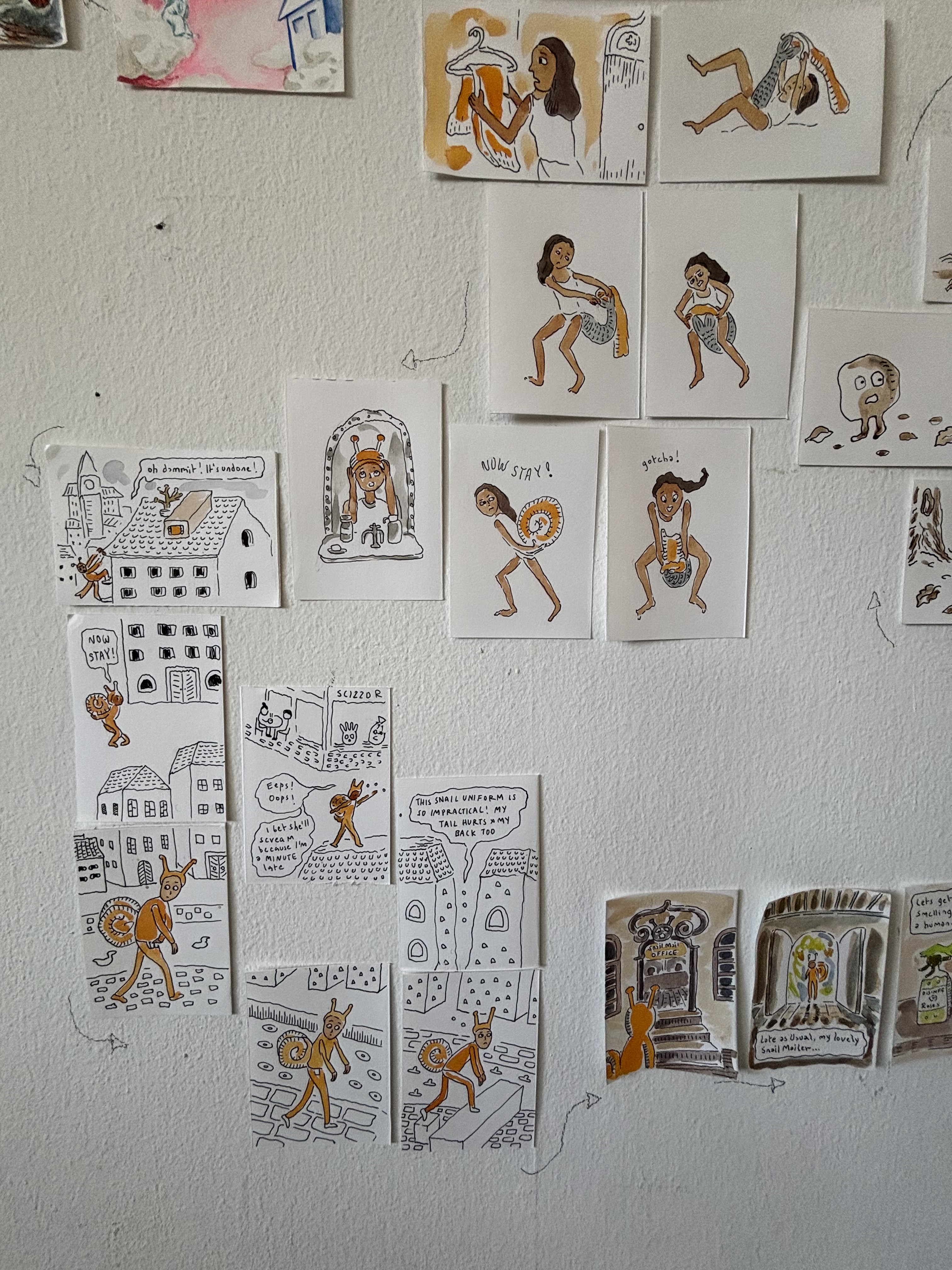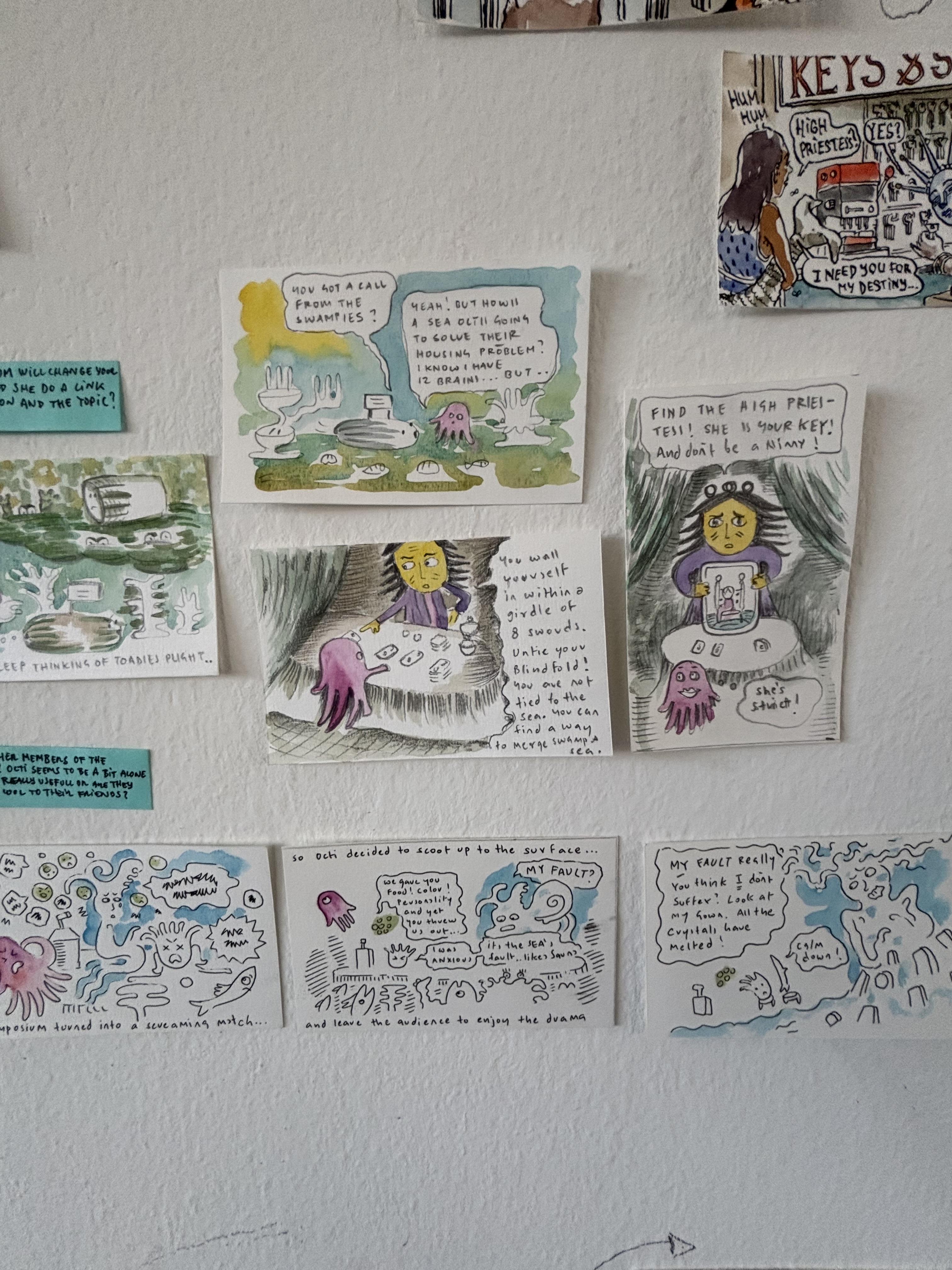 Shoili Kanungo and Kevin Crelerot, artists in resident at the Pro Helvetia – Fumetto Tandem Comic Art Residency 2025, created The Map of Mirage, a sprawling wall comic of more than 500 images that weave and intersect in surprising ways to create an endless story composed of both disparate and interconnected scenes.