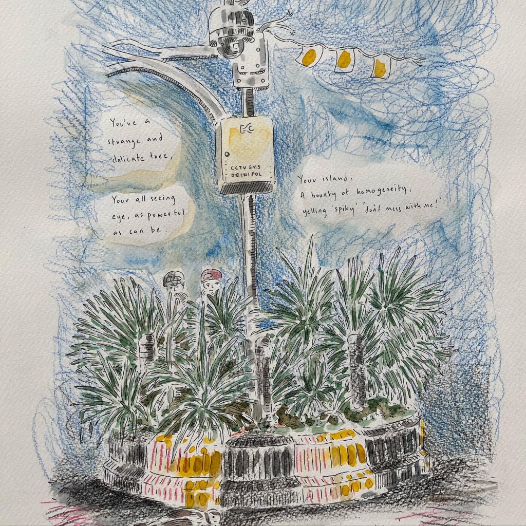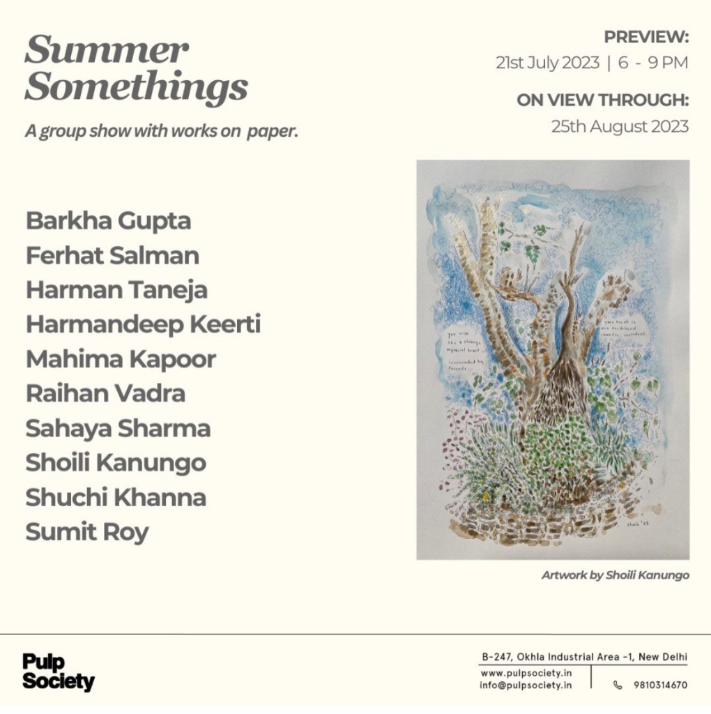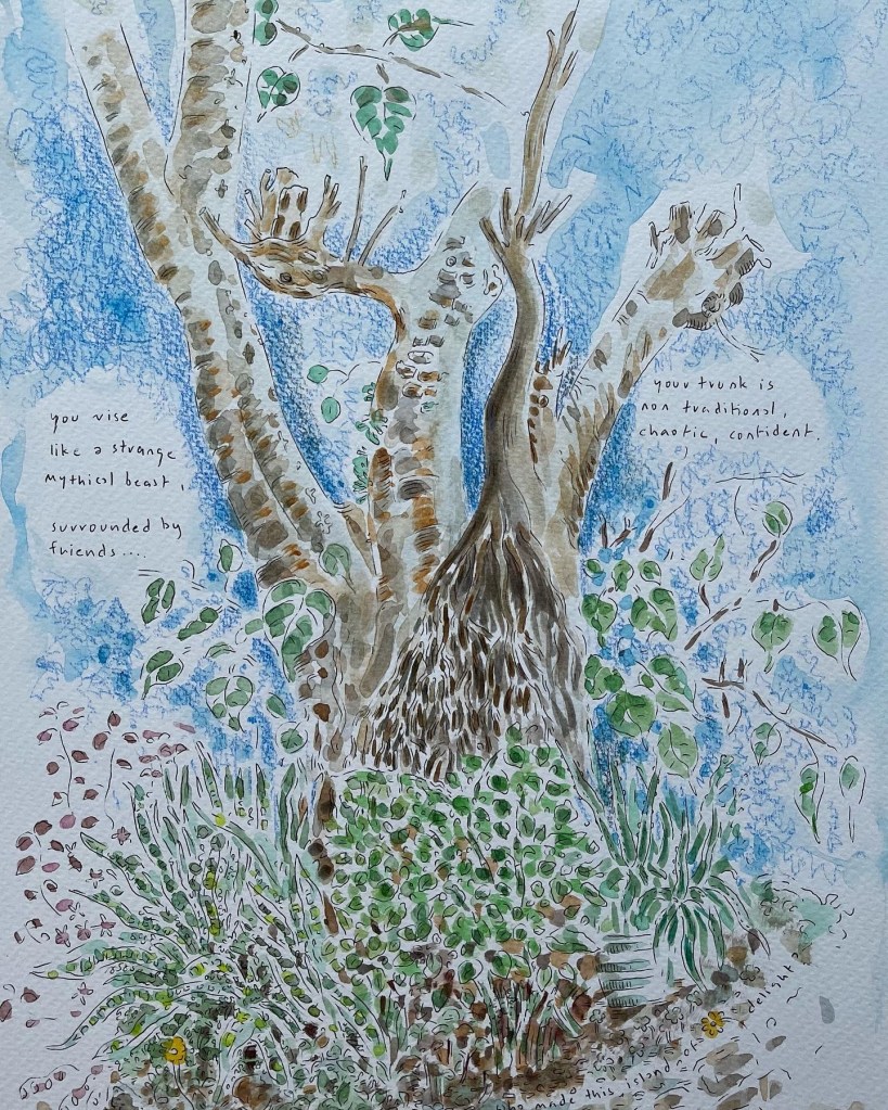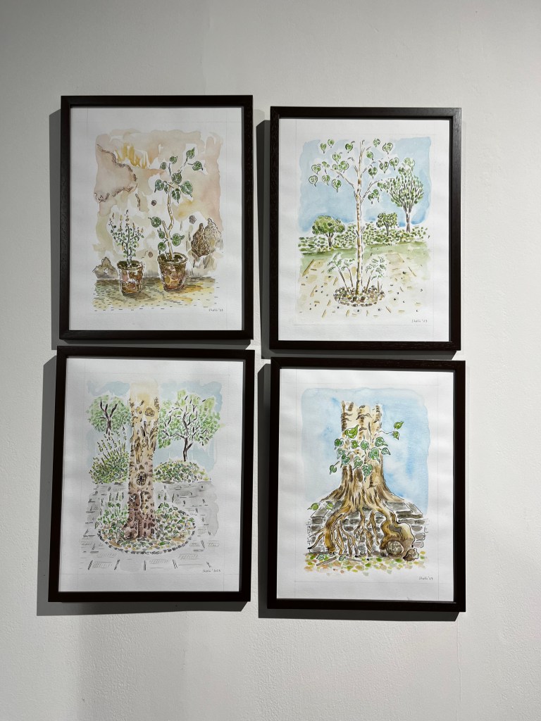 My series on the trees that I observed in my neighbourhood in New Delhi was part of the group show Summer Somethings at Pulp Society, June 2023. I was particularly struck by the all pervasive Peepul Tree which appeared in all its stages of growth – from a diminutive child in a pot to a destructive adult.