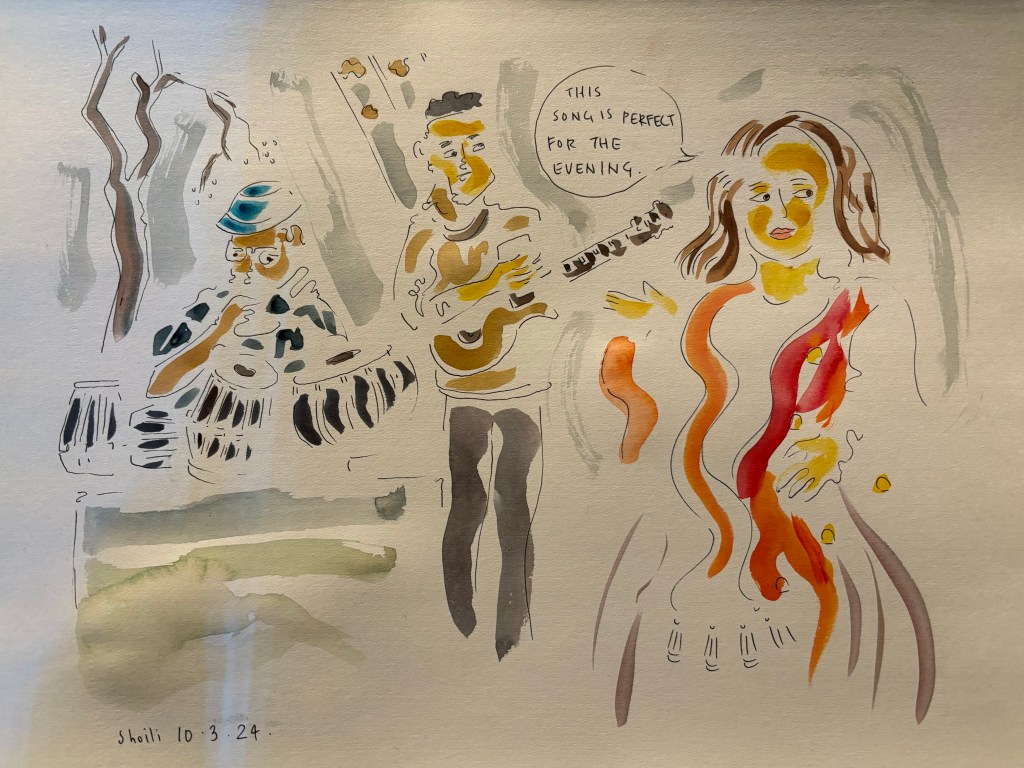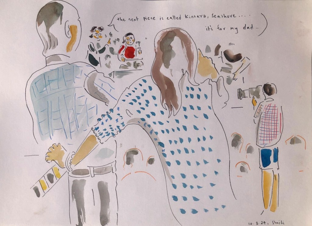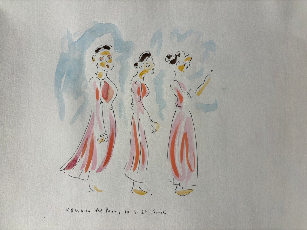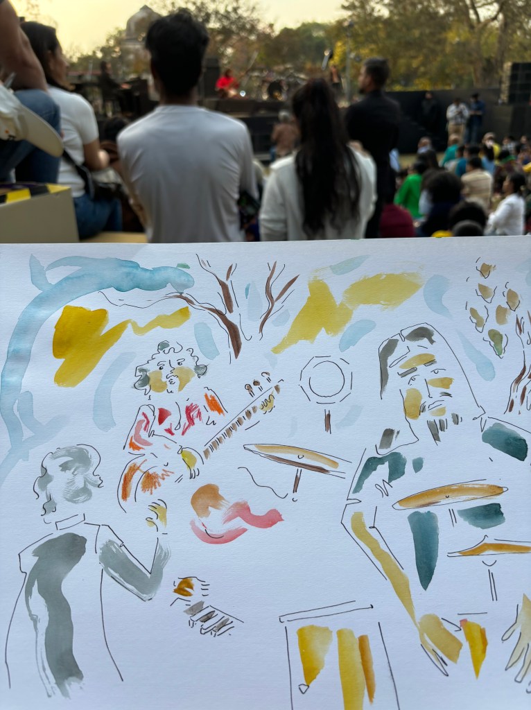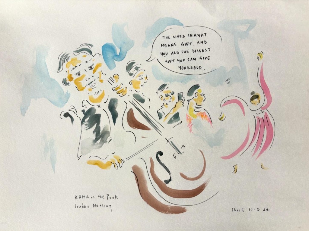 I was commissioned by KNMA to make live drawings of a series of performances that took place on the 10th of March at 2024 at Sundar Nursery. There was music, dance, and theatre. I wanted to capture the spirit of the performers, some of the things that they were saying, and create a general sense of the magic of that evening. The drawings were all made on location with ink and watercolour.