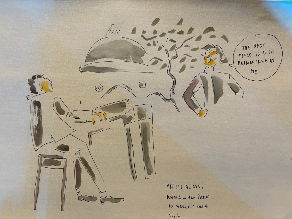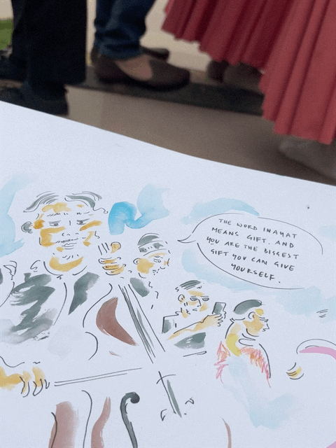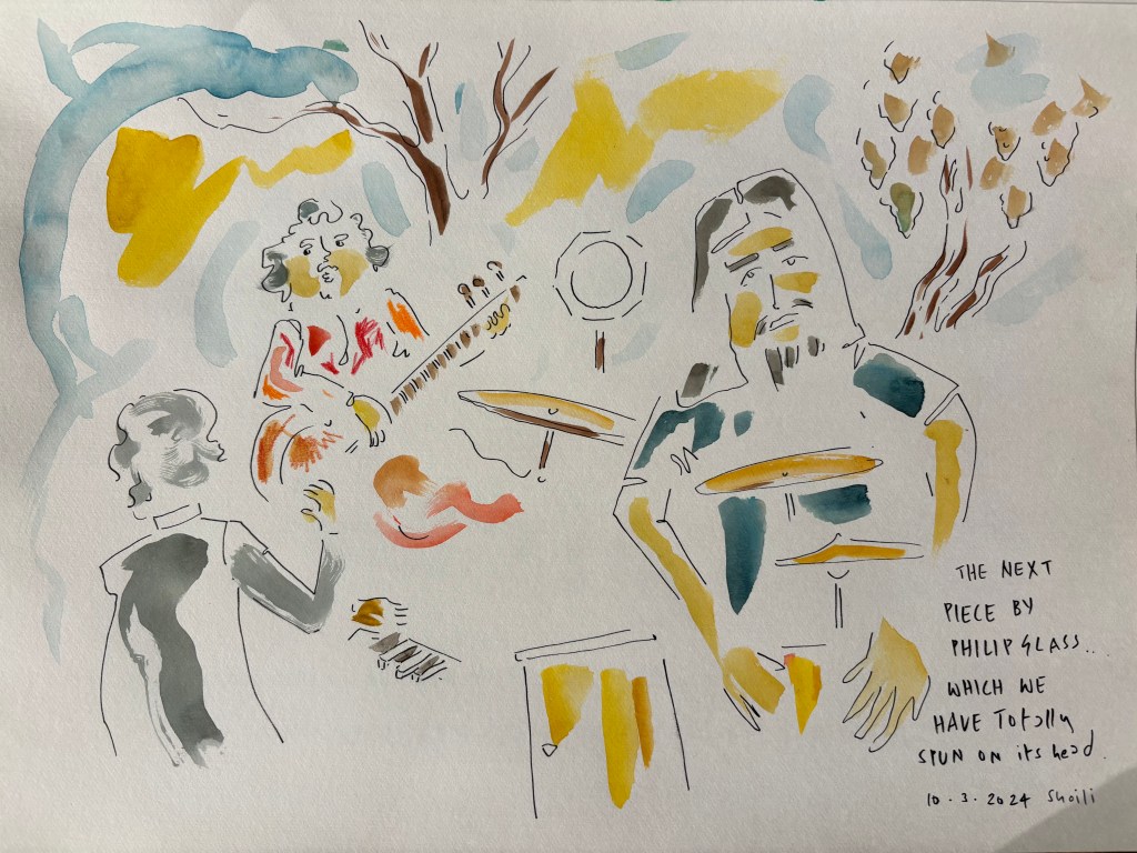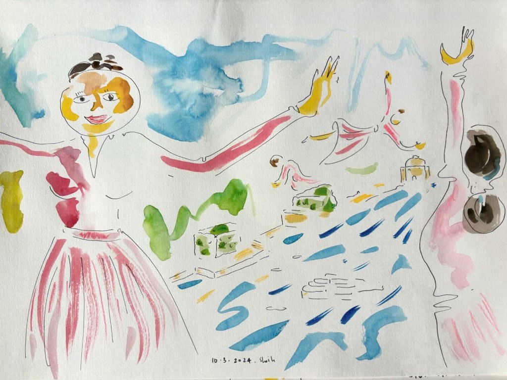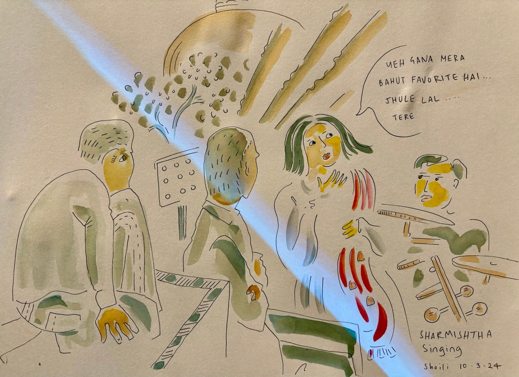 I was commissioned by KNMA to make live drawings of a series of performances that took place on the 10th of March at 2024 at Sundar Nursery. There was music, dance, and theatre. I wanted to capture the spirit of the performers, some of the things that they were saying, and create a general sense of the magic of that evening. The drawings were all made on location with ink and watercolour.