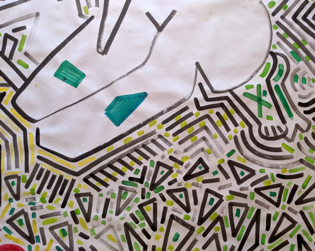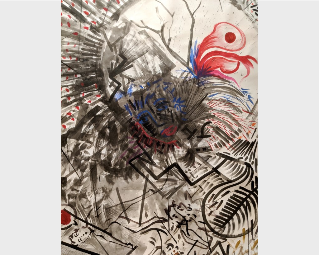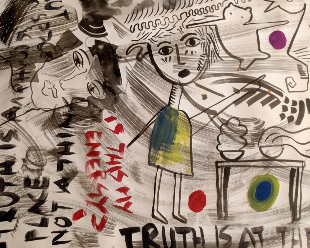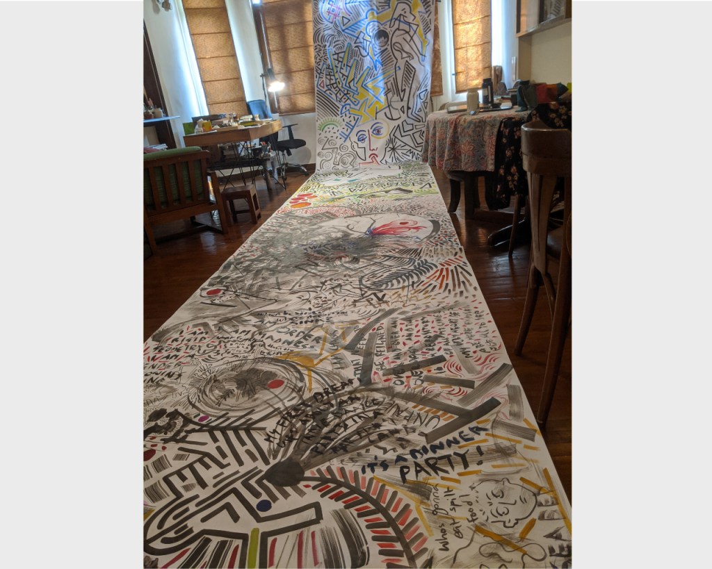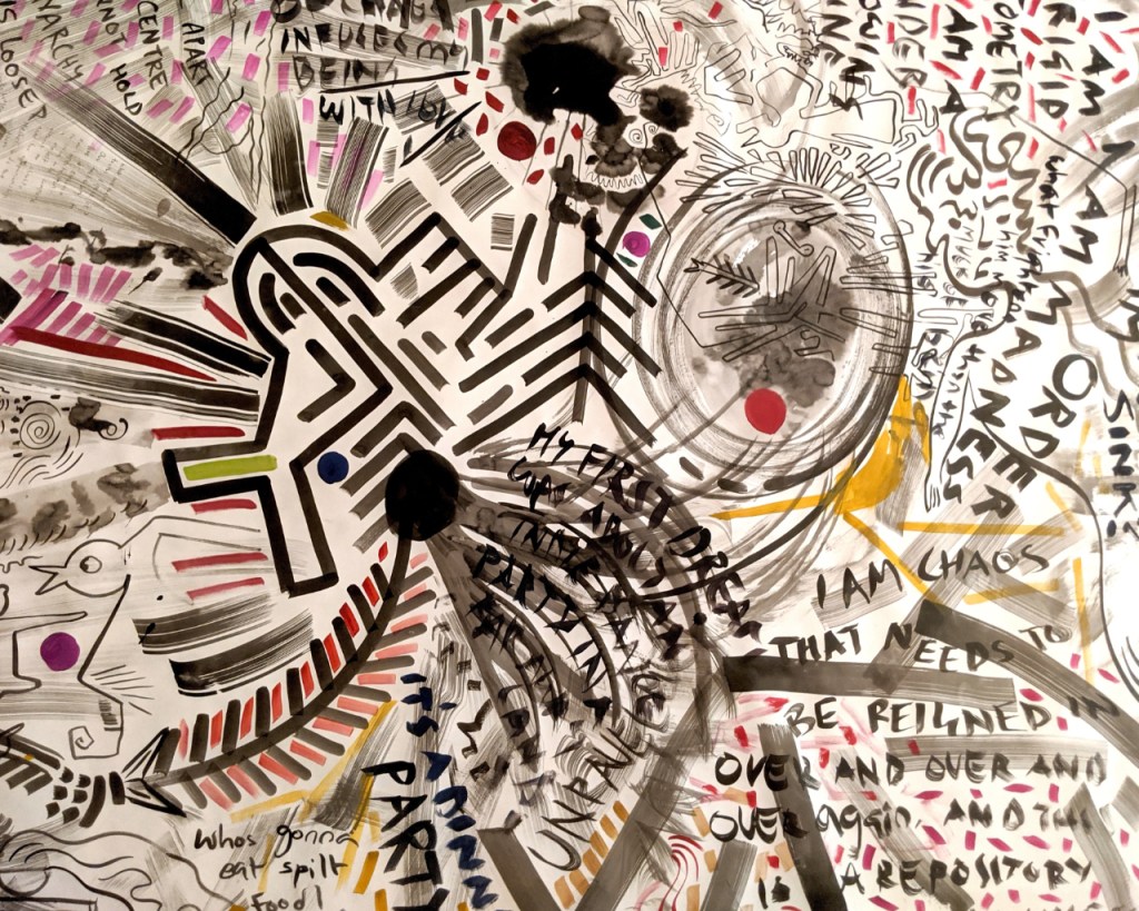 Living alone, in the middle of Lockdown Summer 2020, after a 100 days of no touch contact, I felt the need to order some very large paper online, and draw what I was subconsciously experiencing all over it, the words tumbled out later. Why such large paper? Perhaps because the act of drawing on it felt more tactile. I was sitting on the page, inside my drawing, using thick inky strokes, my arms and legs grazing the paper as I drew. Maybe this was my way to compensate for the lack of touch contact that I was experiencing in my life at that point.