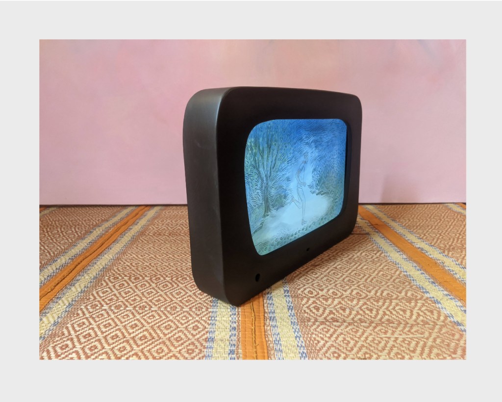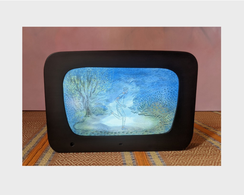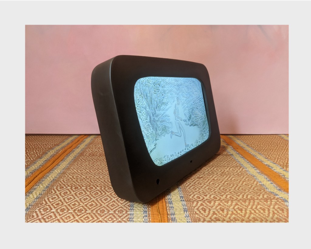 The Runner is a digital time based painting created by Shoili Kanungo. Lucy’s Telly is a wooden and digital device, conceptualised by Shoili Kanungo and designed by Rajat Sodhi. The encasing is a throw back to imaginary stone age tech and mid century modern aesthetics.