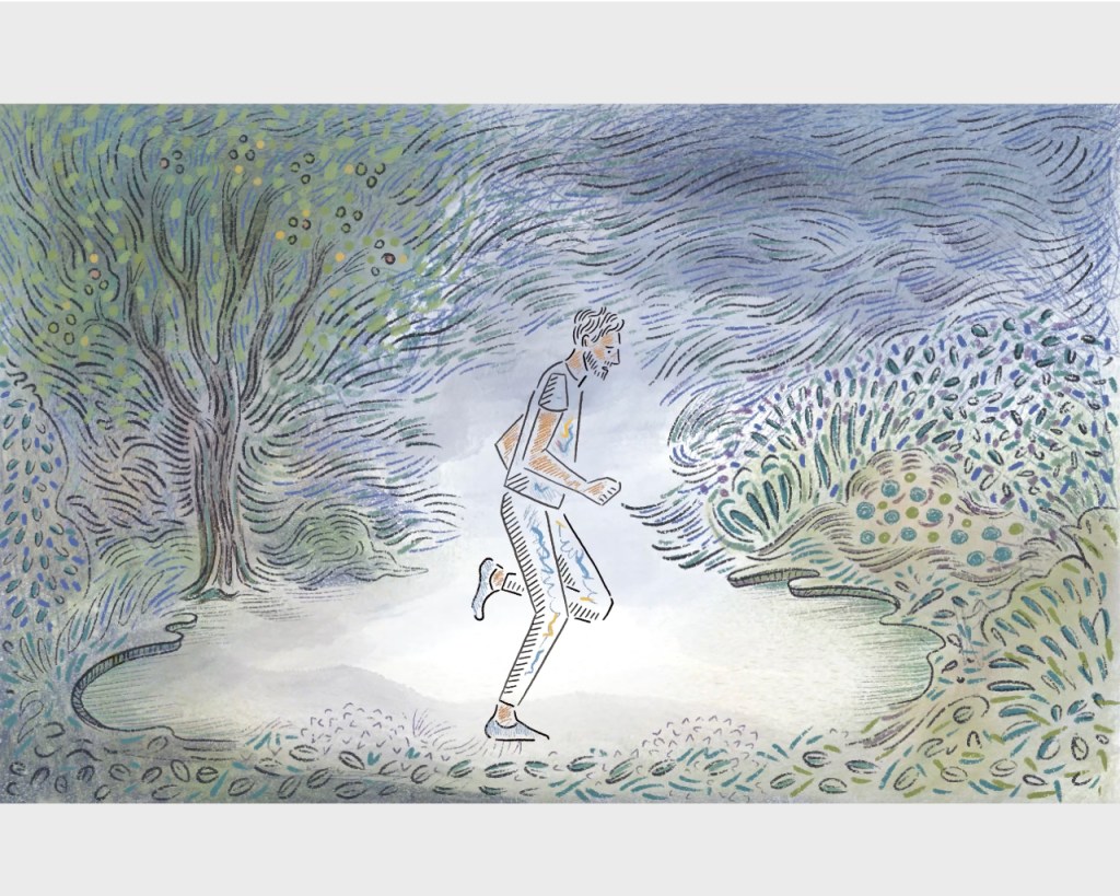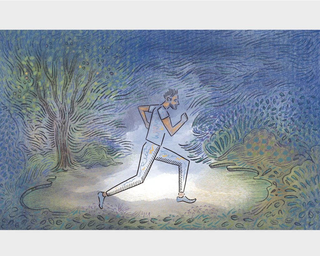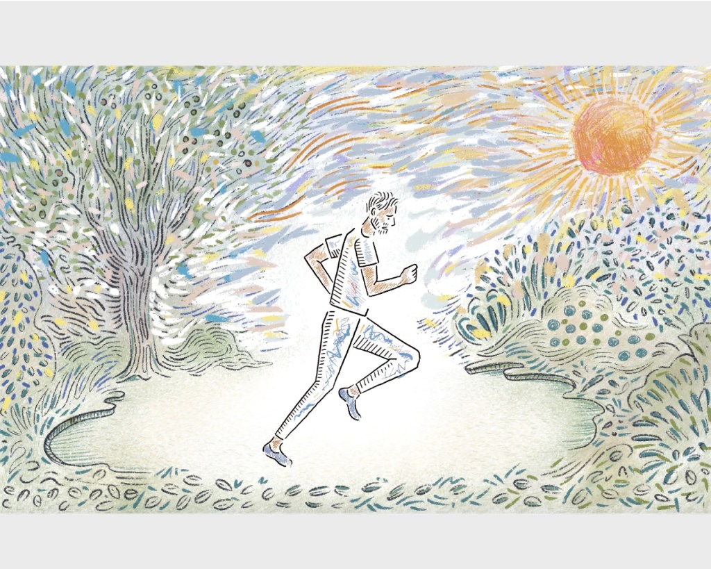 Lucy’s Telly invites you to contemplate the runner’s exceptional determination to just keep running, till he pulls out the sun, over and over again.