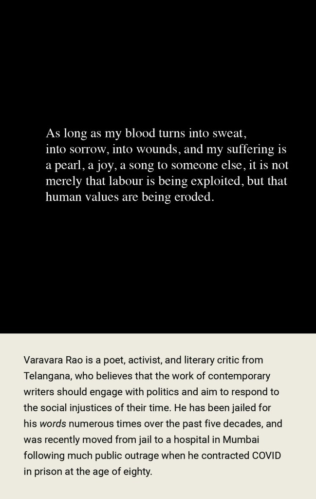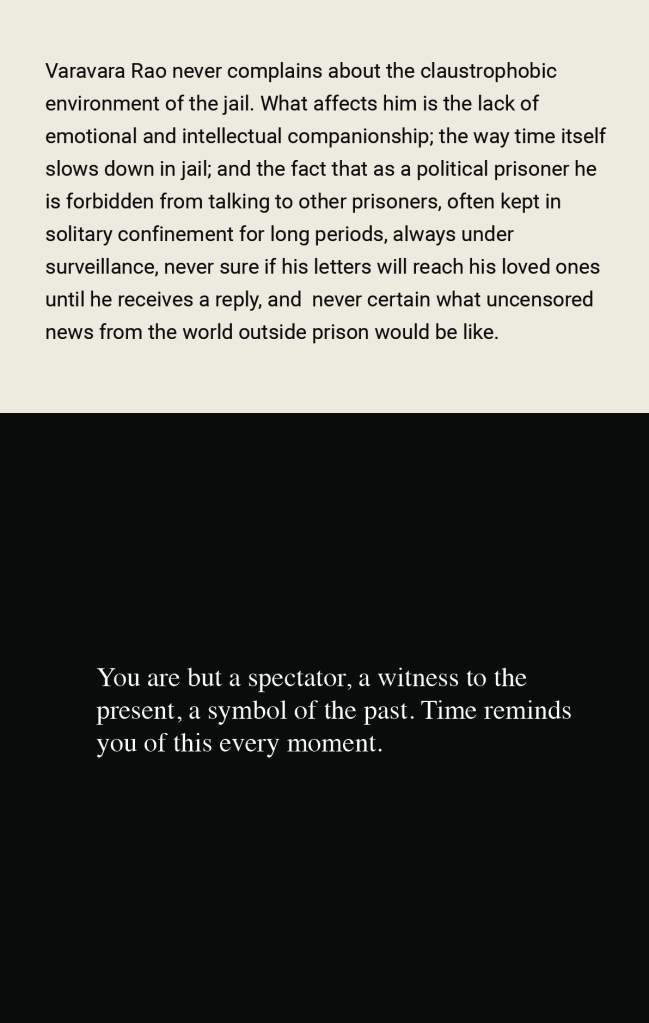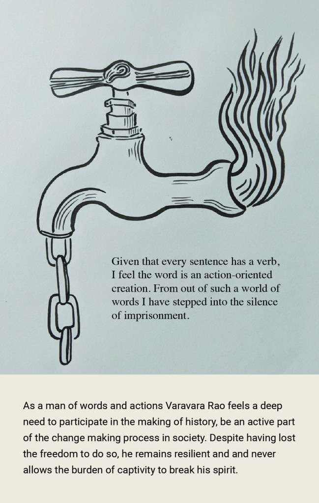 Varavara Rao is a poet and activist who has been in prison repeatedly for his words. What are those words that the State fears? This work explores Varavara Rao’s prison diary, Captive Imagination, written in the 1980’s in jail in Andhra Pradesh. First published in NewsClick.
