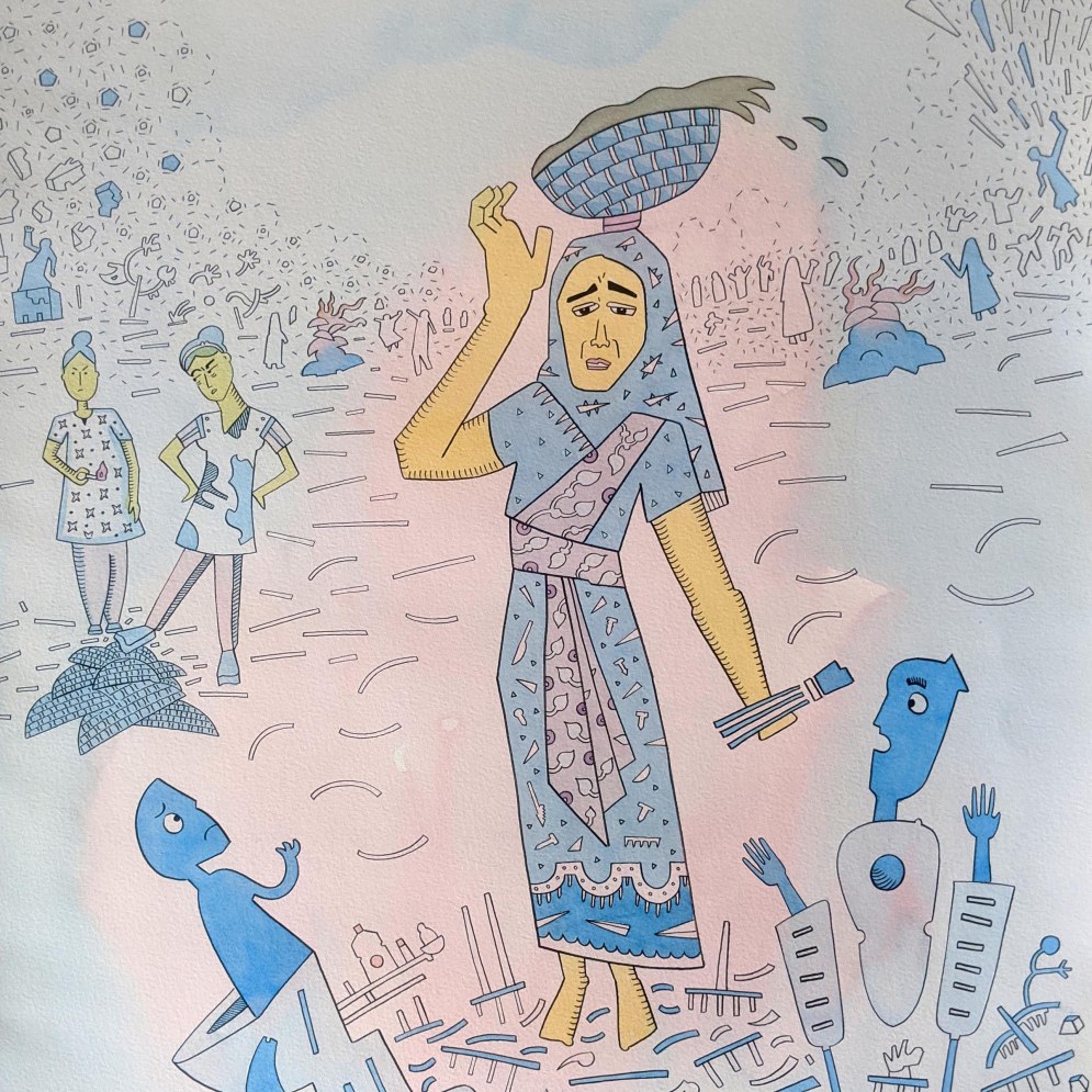 The drawings are an artistic response to the ghastly situation of Manual Scavenging in India, and were exhibited in Fumetto Festival 2019 in Lucerne, as part of the group show, Mytholithics: Graphic Art from India.